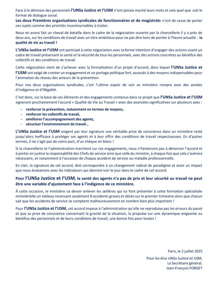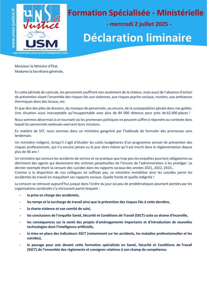 Déclaration liminaire de la Formation Spécialisée Ministérielle – mercredi 2 juillet 2025