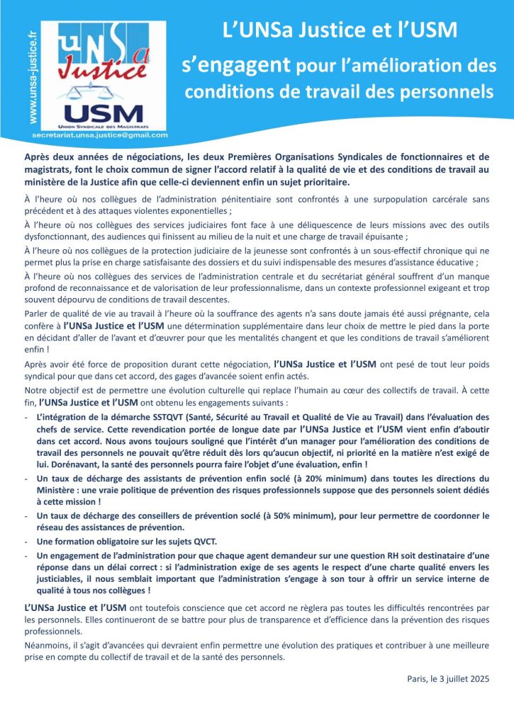 L’UNSa Justice et l’USM s’engagent pour l’amélioration des conditions de travail des personnels