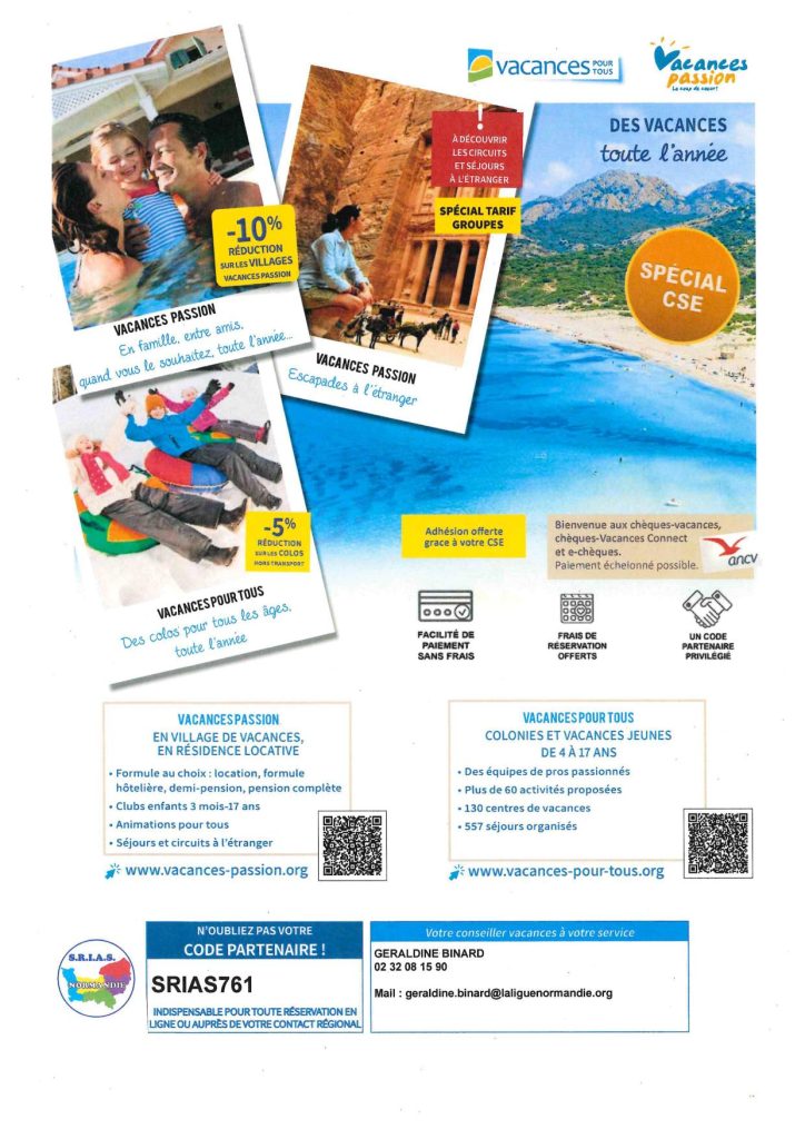La SRIAS Normandie, en partenariat avec « Vacances Pour Tous – Vacances Passion », vous propose des tarifs préférentiels sur les colonies, les villages vacances, les escapades à l’étranger, les vacances en famille.