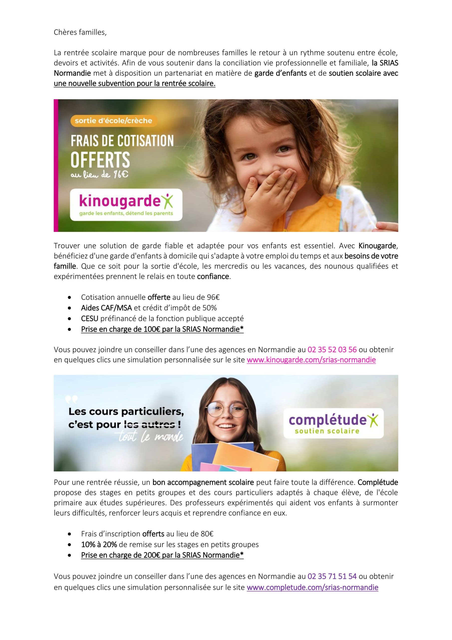 La SRIAS Normandie a renouvelé son partenariat avec KINOUGARDE ET COMPLETUDE. Vous souhaitez bénéficier d’une de ces subventions pour l’année 2025 ? Voici la procédure à suivre : – Prendre contact avec Complétude ou Kinougarde sur leur site internet ( www.completude.com/srias- normandie ou www.kinougarde.com/srias-normandie ) ou par téléphone (en précisant venir de la part de la SRIAS Normandie) ; – Envoyer son en tête de fiche de paie avec le code ministère à Complétude ou Kinougarde pour valider son appartenance à un ministère de la région Normandie ; – Après validation du profil de l’Intervenant(e) chez Complétude ou Kinougarde, votre subvention est créditée chez l’organisme, vous n’avez pas à avancer cette somme.